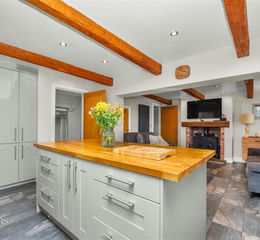 Kitchen - 5.05m x 3.56m (16'7 x 11'8 ) - UPVC double glazed window, a range of panelled wall and base units, solid oak surface, tiled splash backs, ceramic Belfast sink with mixer tap, four door Rangemaster cooker with a five ring gas hob and hotplate, integrated extractor hood, integrated AEG microwave, integrated fridge freezer, dishwasher, wine cooler, exposed beams, spotlights, centre island, tiled flooring, open to the lounge, oak door to the dining room.