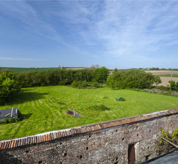 Bedroom - Vaulted ceiling with exposed beams and A frames. Window to the side elevation with countryside views. Exposed brickwork.