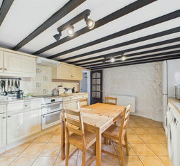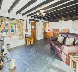 Lounge/Dining Room - 7.39m x 3.73m (24'3" x 12'3") - Part of the original cottage, this spacious reception room has two windows and wooden door to the front elevation. Feature original fireplace with wood-burning stove. Slate tiled flooring and beamed ceilings.