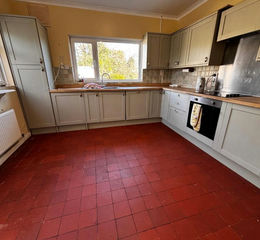 Range of base units with worktops over and matching wall units and tall cupboard. Electric oven with 4 ring hob and extractor fan over. Fitted dishwasher. Stainless steel sink unit single drainer. Radiator, tiled floor and double aspect to side and rear.