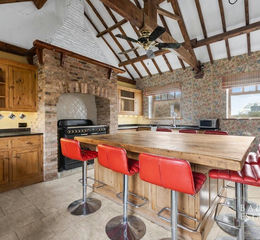 At the heart of the home lies a beautifully appointed farmhouse-style kitchen, generously sized and centred around a substantial island-ideal for both everyday living and entertaining. A large utility room sits conveniently alongside.