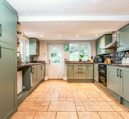 Designed for cooks and families alike, the kitchen pairs pale green shaker units with extensive worktops around a U-shaped layout. Integrated appliances include an oven with extractor hood and a sink set beneath the window. A glazed door opens directly to the garden and the stone tiled floor continues through to the dining room beneath a timber beam.