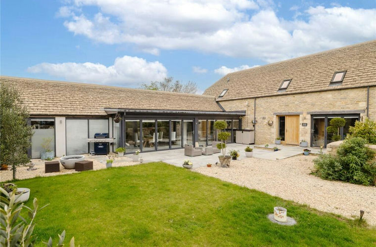 Set along a peaceful farm lane close to the charming market town of Lechlade, this exceptional barn conversion blends traditional character with contemporary living. Redeveloped in 2023, it offers approximately 2,210 sq ft of beautifully presented accommodation, showcasing quality craftsmanship and thoughtful design throughout. Constructed from classic Cotswold stone, the home exudes warmth and elegance. Inside, high-quality finishes include solid oak internal doors, stylish bathrooms, and a professionally designed kitchen with premium Neff and Bosch appliances. The impressive open-plan kitchen, dining and reception space forms the heart of the home. Designed for modern comfort, the property features an air source heat pump, underfloor heating to the ground floor, high-performance double-glazed aluminium windows and doors, and Cat 6 cabling for home working and smart integration. A private gravel driveway provides parking for up to three vehicles and includes an EV charging point. The accommodation comprises four generous double bedrooms and four well-appointed bathrooms, with three bedrooms benefitting from ensuites. The principal suite is further enhanced by a separate dressing room accessed via a striking galleried landing. A welcoming entrance hall, ample storage, and a separate utility room complete the interior. Outside, the landscaped garden combines lawn and patio areas, perfectly suited to outdoor living with carefully designed lighting.