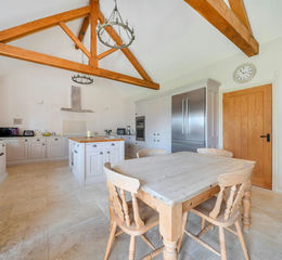 At the heart of the property is an impressive open-plan kitchen, dining and sitting room, featuring a vaulted ceiling with exposed timber beams that create a wonderful sense of space and architectural interest. The kitchen is fitted with stylish shaker-style cabinetry, integrated appliances, and a central island, ideal for both everyday living and entertaining. The living and dining areas flow seamlessly, with views across the garden and direct access outside. The property offers three well-proportioned bedrooms, including a spacious principal bedroom with bespoke built in wardrobes and en-suite. A family bathroom serves the remaining bedrooms.