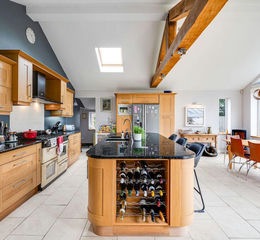 Brimming with light, directly ahead from the front door, step into the sociable kitchen-family room, the heart of the home. Exposed timber beams adorn the 1.5 height ceiling, amplifying the sense of light. A practical kitchen, thoughtfully designed for modern family living, the large, granite-topped central island offers ample storage, alongside breakfast bar seating, and also houses the sink.