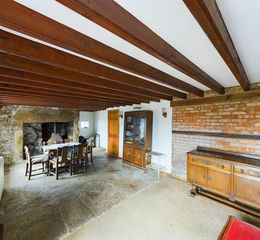 Two double glazed windows to front, inglenook fireplace to one wall (not used), further open fireplace to other wall, two fan assisted night storage heaters, granite flagstone floor, open beam ceiling, wall lights, exposed granite chimney breast and brick wall to one elevation, further window to side, door to: