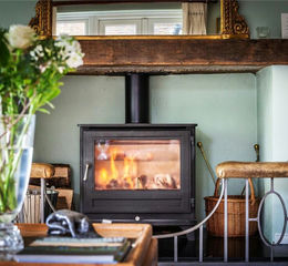 The main drawing room has a large, centralised fireplace with a wood-burning stove, side doors to the garden terrace and a super full-width curved bay window drinking in the views of