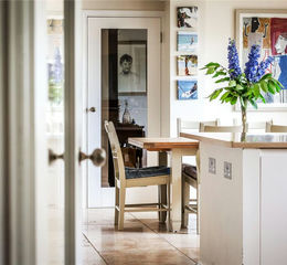 and a host of display cabinets. The 4 oven gas Aga with power flue adds a touch of country charm, a separate cooking station with a double electric Bosch oven, Bosch warming draw, Integrated AEG microwave, induction hob and extractor all provide alternative cooking facilities. With ample space for a family breakfast table and doors to the garden, this wonderful kitchen is the hub of the house.