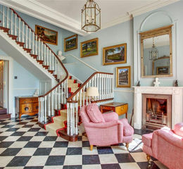 The accommodation boasts an expansive interior with beautiful high ceilings, period features, original fireplaces, and a spectacular reception hall, sweeping staircase, open fireplace, and black & white chequerboard tiled floor. There is a lovely pillared entrance portico leading through the to the main accommodation which is on the ground and first floor. Accessed from the main Hall are the Drawing Room and Dining Room – magnificent rooms opening through to the stunning orangery which has spectacular south westerly views. There is an additional entertainment room on the ground floor enjoying fabulous views – this stunning home has at times been used to host private events. The kitchen/breakfast room is comprehensively fitted with a range of built in units, range cooker and appliances.