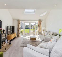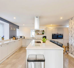 The heart of the home is the impressive open-plan living and dining area, a bright and airy space enhanced by a charming wood-burning stove, creating a warm focal point. There is ample room for both relaxation and entertaining, with double doors opening out onto the garden. Karndean flooring features throughout the kitchen, hallway, WC and rear porch. The adjoining L-shaped breakfast kitchen and snug offer a stylish and versatile living space. The kitchen is fitted with elegant marble worktops and a range of wall and base units, complemented by integrated appliances including a washer dryer, dishwasher, fridge freezer, double ovens, one with microwave, proofing draw, 2 wine coolers, induction hob, and extractor. The snug area provides an ideal family space, while a side porch offers additional access to the rear garden patio and second parking area.