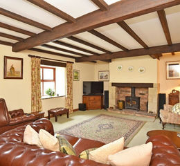 A spacious reception room with exposed beams and windows to front. Attractive fireplace with multi-fuel stove.