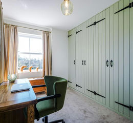 Upstairs, four well-proportioned double bedrooms are served by a bathroom finished to the same standard that runs throughout — a freestanding bath, pedestal washbasin, and low-level WC. One bedroom is currently dressed as a home office, with a full-width range of wardrobes and storage that also houses the hot water tank: flexible space that works hard whatever its use.