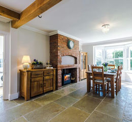 Inside, the quality of finish is consistent throughout. The kitchen is a serious room — Listers units with granite worktops, a range cooker with extract hood, an integrated pantry with dishwasher, and tumbled limestone flooring. The whole ground floor benefits from underfloor heating fed by an air source heat pump, with radiators to the remainder of the house. Solar panels with export capability via Octopus complete an energy setup that is both modern and well considered. Cast iron wood burners sit in both the living room and kitchen, set into original fireplaces — the kind of warmth that cannot be retrofitted.