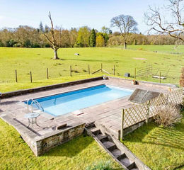 Externally, the property offers an exceptional lifestyle setting. Gated access at the front leads to a small private drive, while a separate sweeping driveway opens onto an extensive cobbled courtyard, providing vast parking and direct access to a range of outbuildings. The formal gardens flow gracefully from the house, with steps rising to a recently reinstated swimming pool, positioned to take full advantage of the elevated outlook and the surrounding countryside. Beyond the gardens, a paddock of just under 4 acres extends from the pool, complemented by a stocked orchard and approximately half an acre of woodland, offering both beauty and practical use. A range of outbuildings, including a barn and former stables further enhance the property, making it ideal for equestrian pursuits or those seeking versatile outdoor space. Altogether, the combination of gardens, paddock, pool and outbuildings creates a rare opportunity to enjoy both luxury and functionality in a stunning rural setting.