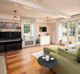 The top lawn is edged by mature herbaceous borders along with specimen trees and at the top is a timber garden studio enjoying wonderful views back to Dove House. A raised Indian stone dining terrace overlooks the recently refurbished octagonal swimming pool edged by extensive paved seating and leisure area.