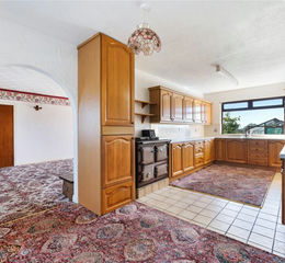 The kitchen is fitted with a range of timber cabinets and features a characterful vintage Rayburn cooker alongside a standalone cooker. Adjoining the kitchen is a generous utility room, which offers access to the rear porch and the attached garage.