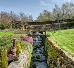 Rear Garden - This is paradise for keen gardeners and perfect for all the family. Over more than two decades, the current owners have cultivated this extensive garden and bought neighbouring land so that the overall plot now extends to approximately 1.2 acres. The garden includes a large dining patio, brook and waterfall, two bridges, a garden room, orchard and lovingly-tended lawns. Herons, wagtails and kingfishers are regular visitors with several nests located in the high walls above the brook.