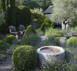 A Mediterranean courtyard has an olive tree, lavender, and mature yew and box topiary all around an antique stone horse trough repurposed as a bubbling water feature. There are late-flowering perennial borders which go through from May to stand all winter.