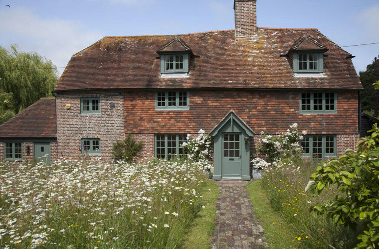 French Court Farmhouse is reached via an old farm track, an approach that amplifies its sequestered, pastoral feel. A charming ruddy façade greets on arrival, peering above the wildflower-filled front garden. A brick-laid path guides towards the front door and porch, which, as with the windows, is painted in a soft, muted green shade.