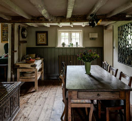 An 18th-century winder staircase ascends to the first floor, where three bedrooms lie. The principal is especially characterful, with fitted cupboards, 17th-century oak floorboards, 'London Clay'-painted walls and an adjoining WC. The second bedroom also features 17th-century oak floorboards and fitted wardrobes, plus 18th-century tongue and groove panelling. There is also a smaller bedroom on this level, which would make for a wonderful dressing area or study, and a shower room with a walk-in shower and an Albion basin.