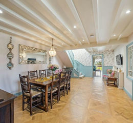 A striking and versatile central space at the heart of the home, ideal for formal and informal dining and gatherings. The room features a beamed ceiling, elegant Versailles parquet oak flooring and a charming library nook with fitted shelving and seating. A dramatic double-height ceiling extends to the apex of the barn, creating a wonderful sense of space and light, complemented by a galleried landing above.