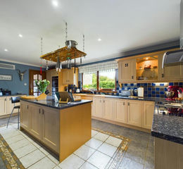 Painted in a refreshing blue tone with attractive décor floor tiles, this spacious kitchen is fitted with wooden cabinetry, a stone-effect laminate worktop, tiled splashback and stainless steel sink with wooden drainer. A large kitchen island with a breakfast bar, ceiling pan rack and built-in preparation block provides a practical workspace. Integrated appliances include a Zanussi fridge freezer, Neff oven, combi-oven, dishwasher, deep fryer, electric hob, and extractor hood. The kitchen opens to the breakfast room and back hallway.