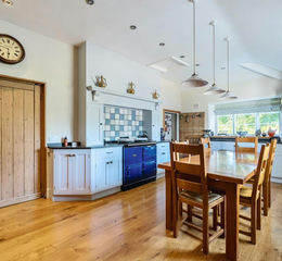 The ground floor centres around a characterful farmhouse-style kitchen/diner, complete with a walk-in pantry and adjoining utility room. The living room features a clear-view log burner and bay window. A second reception room offers further versatility.