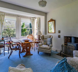 Living Room - The living room is a bright and inviting space, featuring a front-facing bay-style window that fills the room with natural light. A central wood-burning stove creates a cosy focal point, complemented by high ceilings that enhance the sense of space. There is ample room for comfortable lounge furniture, making it ideal for relaxing or entertaining.