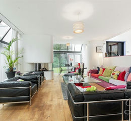 Sitting Room - 7.06 x 7.54 (23'1" x 24'8") - This expansive sitting room exudes sophistication, showcasing striking architectural features that make it truly unique. A stunning array of windows at every angle frames picturesque views of the surrounding landscape, flooding the space with natural light. The seamless connection to the outdoors is enhanced by both sliding and patio doors leading to the garden, perfect for indoor-outdoor living. High ceilings elevate the sense of space, while a captivating feature fireplace adds warmth and character, creating a grand yet inviting atmosphere.