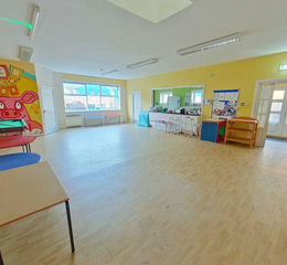 Enter the building via the main entrance into the reception area. It has a glass external door with matching window panel, an internal glass door to playroom 1, laminate flooring, an internal window to the office and a cupboard housing the electric meter/fuse box.