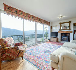 The sitting room also showcases the panoramic view as it features full-height wall-to-wall windows and a set of sliding glass doors. This space also includes an inset log-burning stove, housed beneath a wooden mantle, therefore presenting a cosy space to enjoy the Wye Gorge during the colder months of the year.