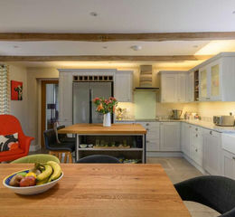 The sitting room is anchored by a substantial original stone fireplace housing a wood-burning stove, with glazed doors opening onto the gardens. The dining room features another wood-burning stove, offering an inviting setting for hosting or quieter evenings. A snug provides a versatile space for relaxation, featuring French doors that open to the garden. A convenient boot room adjacent to the dining room completes the ground floor, providing ample storage space featuring full shelving and a hanging rail.