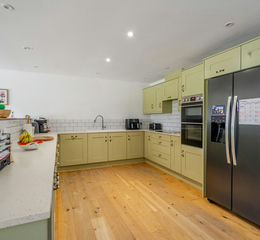 Step into the sizeable, welcoming porch, perfect for coats and muddy boots after countryside walks. The heart of the home is the stunning open-plan living space, which seamlessly combines lounge, dining, and kitchen areas. Engineered oak flooring runs throughout, complemented by underfloor heating powered by an efficient air source heat pump system. Natural light floods the space through two sets of front-aspect bi-fold doors, connecting the interior with the beautifully landscaped front garden. The lounge features a characterful woodburning stove, while the adjacent dining area provides ample space for family meals or entertaining. The bespoke handmade kitchen is a highlight, fitted with a double oven, induction hob, integrated dishwasher, and elegant marble work surfaces. Also on the ground floor is a generously sized double bedroom with its own ensuite shower room, perfect for guests or multigenerational living. Completing the downstairs is a utility room and a (truncated)