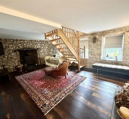 Lounge - 4.23 x 6.07 (13'10" x 19'10") - with open tread oak stairs to first floor, Log burner, French oak floor, 2 wall lights, downlights, radiator, exposed stone walls, and uPVC double glazed window to front.