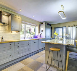 The property welcomes you into a spacious reception hall, with stairs rising to the first floor and access to a convenient ground floor WC/cloakroom. The kitchen is a bright and contemporary space, thoughtfully designed to blend style with everyday practicality. It is fitted with a range of modern wall and base units in a classic shaker style, offering ample storage alongside generous worktop space. A central breakfast island with a contrasting work surface provides an ideal spot for informal dining. Integrated appliances include an oven, hob with overhead extractor, auto-dosing dishwasher, and a boiling water tap.
