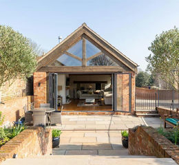 This striking brick-built barn conversion is a beautifully appointed family home that honours its heritage while sitting seamlessly within the village’s vernacular architecture. High ceilings and generously proportioned rooms define the house, with carefully sourced salvaged materials adding depth of character. At its heart is a vaulted, open-plan kitchen, dining and living space extending over 50 ft across two levels and opening west onto the garden.