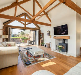 From the kitchen/dining room steps ascend to the sitting room, a dramatic vaulted space with engineered oak flooring and a large multi-fuel stove. There are south facing windows and a fully glazed A-frame on the western elevation with bifold doors that open directly to the garden terrace.