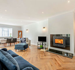 Dining Room - A double aspect room with bi-folding doors opening to south facing terrace. Double glazed window to side elevation. Central fireplace with fitted wood-burning stove.
