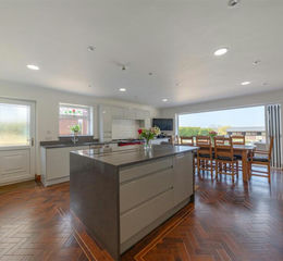 Kitchen/Breakfast Room - 6.88m x 5.08m (22'7 x 16'8) - A light and spacious open plan area with under floor heating beneath Spanish Cherry Amtico herringbone flooring fitted with high gloss floor and wall cabinets with polished granite working surfaces incorporating an island unit with breakfast bar and Smeg ceramic hob. Built in appliances include the Fisher and Paykel two drawer dishwasher, Smeg eye level double ovens, wine chiller, American fridge/freezer and separate freezer and an electric four oven Aga with two hot plates and electric side warmer and there is also an air conditioning unit. Bi-folding doors open to the rear terrace and garden.