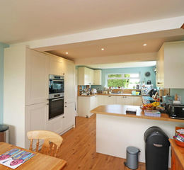 KITCHEN/ BREAKFAST ROOM 26' 09" x 10' 06" (8.15m x 3.2m) dual aspect windows to the front and rear, oak effect flooring, the kitchen comprises a range of shaker style wall and base units to three sides providing extensive storage space along with space for the built in eye level double oven, washing machine, dishwasher and storage pan drawers. Work surface extends further over the peninsula unit providing yet more preparation space, the work surface also provides provision for the inset four ring induction hob with extractor over and the ceramic Rangemaster sink and drainer under the rear window. Generously sized dining area and door to the: