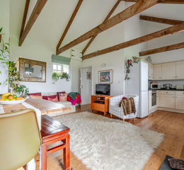 Across the entrance hall is a door into a light and airy open-plan living space; currently used as annexe accommodation. A door off the living room area leads out to a private patio space, and there is a well-equipped kitchen area as well as a bathroom on this level. The bathroom has a double-ended bath with a shower over, completing the modern suite. A set of stairs in one corner of the open plan living room lead up to a beautiful mezzanine bedroom with built-in storage cupboards and a large Velux rooflight offering views across fields towards Sennen.
