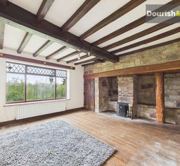Step inside and you are welcomed by an entrance hall, where doors lead to the principal reception rooms. The dining room offers a wonderful setting for entertaining, while the separate living room is rich in character, featuring an open fire grate nestled within an inglenook-style fireplace, complete with decorative brickwork, a wooden support pillar, and a traditional timber mantle. Decorative beams to the ceiling further enhance the room’s charm, and a door leads through to the kitchen.