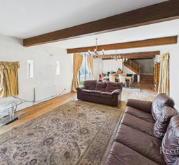 An impressive open plan living and entertaining space full of charm and character, featuring a stunning floor to ceiling glazed window to the front aspect, exposed beams, and multiple windows and doors to the rear opening into the garden. Two central heating radiators and a striking stone fireplace and inset log burner create a focal point to the room. Door leading to front entrance hallway and additional access to a versatile study room.