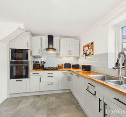 Modern fitted units to walls and floor, wooden work surface over, stainless steel one and a half bowl sink unit with mixer tap and drainer, integrated Neff electric oven, Neff combi oven/microwave, integrated Bosch gas hob with extractor hood over, integrated dishwasher, space and plumbing for washing machine, space for upright fridge/freezer, breakfast bar, UPVC double glazed entrance door opening to side, UPVC double glazed window to rear, tiled splashback, radiator.