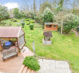 Rear Gardens - A superb formal garden area mostly lawned with large two tiered decking, pergola with tiled roof, power, ideal for hot tub, large established trees and shrubs, access to wooded area, side entrance gate.