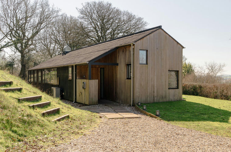 A private driveway sweeps up to the house’s cedar front door. Inside, an entrance hall with room for coats and shoes leads to a vast open-plan kitchen, living and dining area, its vaulted double-height ceiling bisected by alternating glulam and green-painted roof trusses. Banks of glazing extend across one wall, opening onto an outdoor terrace with far-reaching views toward the Sugar Loaf and the Black Mountains.
