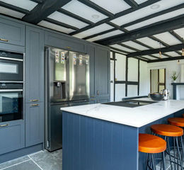 Entrance from front garden. Double glazed window to front. Door to inner hall and sitting room. Recently refurbished kitchen with dark navy units and white compound Dekton marble effect work surface. Stone flooring, exposed black and white panelling and characterful original stone wall. Central island with BORA four ring induction hob with integrated extraction, two self cleaning NEFF double ovens, integrated dishwasher, Belfast sink with brass QUOOKER instant hot boiling water tap. Space for American style fridge freezer.