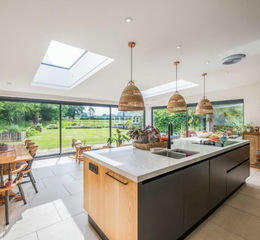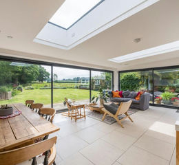 • The open-plan family/kitchen/dining room forms the heart of the home, enhanced by expansive sliding doors across two elevations, and roof lanterns that draw in sunlight throughout the day, making the most of the south-facing