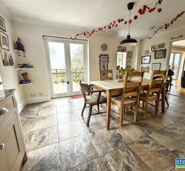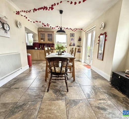 An exceptionally large, triple-aspect living space filled with natural light. Featuring bifold doors and additional uPVC double-glazed French doors opening onto the patio terrace. A wood-burning stove set on a slate hearth creates a focal point, complemented by part oak flooring, two radiators, and an open-plan flow into the dining area.