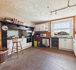The kitchen is particularly spacious, fitted with a wide range of units and centred around a large original fireplace. A secondary staircase leads from here to the first floor, adding to the character and practicality of the layout.